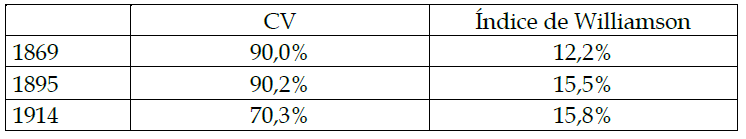 En la tabla anterior, estos índices muestran una alta heterogeneidad en el proceso de urbanización. El CV alcanza valores muy elevados para los dos primeros censos y desciende en el tercero, cuando las regiones del interior comienzan a aumentar su proporción de población urbana. Mientras que el índice de Williamson, muestra una disparidad creciente. Esta diferencia se explica por la ponderación por tamaño de población que introduce el índice de Williamson. A partir de esta comparación se puede afirmar que las provincias con mayor proporción de población total al comienzo del período son aquellas en las que las ciudades crecieron más rápidamente. Es decir que las provincias con mayor población (y, por lo tanto, con mayor ponderación) fueron las que experimentaron un mayor crecimiento de la población urbana.