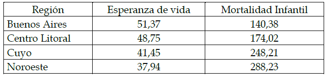 En cuanto a la mortalidad infantil en el trabajo citado de Somoza se calcula las probabilidades de permanecer vivo durante los cinco años siguientes, por edades y regiones. Se toma como indicador de mortalidad infantil la probabilidad que tiene un recién nacido de alcanzar la edad de cinco años. Según estos cálculos, en consonancia con los de esperanza de vida, durante los años 1913-1915 un recién nacido en Buenos Aires o en el Litoral tenía prácticamente el doble de probabilidades de vivir hasta los cinco años que si lo hubiese hecho en Cuyo o el Noroeste del país.
