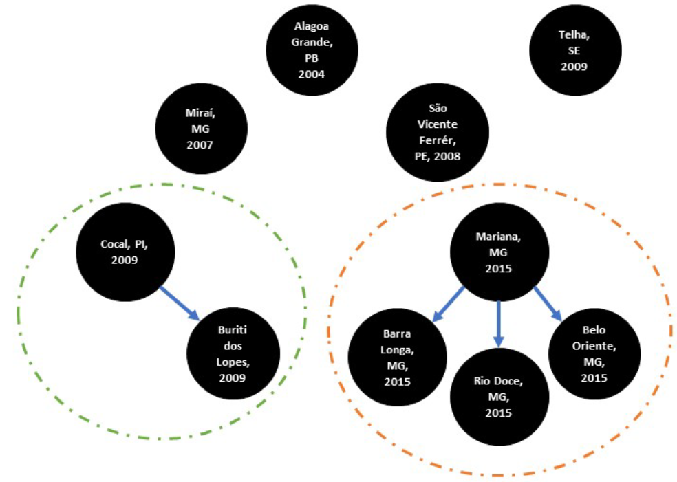 Ademais, nessa composição ampliada, vínculos interestaduais num mesmo desastre passaram a ter visibilidade, como quando, em 2007, o desastre atravessou os limites do estado de Minas Gerais (MG) em direção ao Rio de Janeiro (RJ) e, também, em 2015, quando o desastre atravessou os limites do estado de Minas Gerais (MG) em direção ao estado do Espírito Santo (ES), ampliando de cinco para sete as Unidades Federais de ocorrência (à lista anterior, acresceu-se o estado do Rio de Janeiro e o do Espírito Santo). Continua-se com os mesmos seis conjuntos informados na figura anterior. Porém, a composição desses se altera em metade das situações, as quais são substancialmente incrementadas. Apenas dois conjuntos permanecem com um município isolado reportando o desastre (Telha/SE, de um lado e São Vicente Ferrér/PE, de outro, ocorridos respectivamente em 2008 e 2009). Cocal/PI e Buriti dos Lopes/PI continuam associados no desastre ocorrido em 2009 sem que houvesse nenhum acréscimo espacial. Porém, antes isolado, o município de Miraí ganha a companhia dos municípios de Muriaé/MG e Itaperuna/RJ no desastre ocorrido em 2007 ao passo que Alagoa Grande/PB ganha mais três municípios paraibanos associados ao mesmo desastre causado pelo colapso da barragem de Camará, quais sejam, Alagoa Grande/PB, Mulungu/PB e Areial/PB. O colapso da barragem de Fundão, reportado pelo município de Mariana e outros três municípios, ganha a companhia de mais 34 municípios que reportaram apenas os efeitos colaterais (Figura 2).