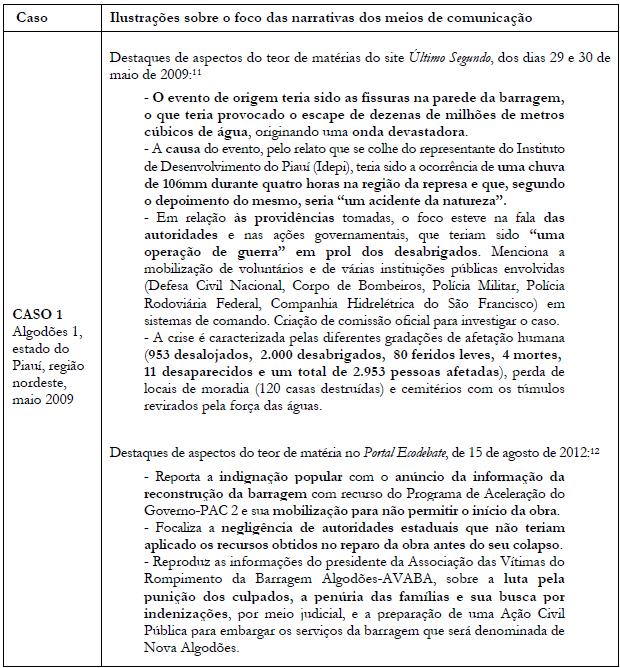 Assim como a base de informações de defesa civil fragmenta aquilo que, ao nosso ver, deveria estar entrelaçado em termos de informação pública sobre colapso de barragens, também as narrativas midiáticas deveriam superar a tendência de descrição acrítica tanto do evento de rompimento da barragem quanto das providências de resposta. Para deixar essa questão em aberto para estudiosos de análise do discurso, porém ilustrar o teor de nossas preocupações sociológicas, tomamos aleatoriamente ilustrações de notícias que foram veiculadas virtualmente — no período imediato ao colapso e em momentos posteriores — acerca de três diferentes casos. O propósito foi o de apontar, no caráter mais geral das narrativas ali produzidas, quais as explicações tendem a ser dadas para esse tipo de evento.