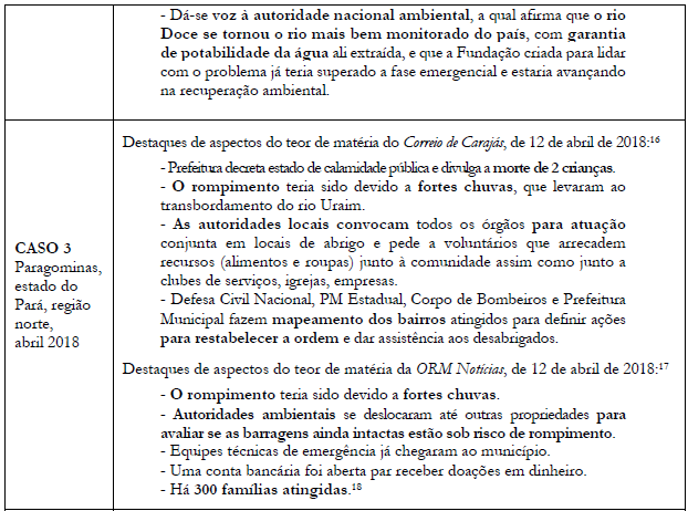 O caso 1, ocorrido no estado do Piauí (PI), na macrorregião nordeste do país, aborda o desastre envolvendo a barragem de Algodões 1, inserida no município de Cocal, a qual colapsou no ano de 2009. O caso 2 se refere ao rompimento da barragem de rejeitos de Fundão, em 2015, a qual era constitutiva de um empreendimento minerário no município de Mariana, estado de Minas Gerais (MG), na macrorregião sudeste do país, o qual foi inicialmente tratado pela autoridade presidencial como um desastre “natural”, conforme o decreto emitido em 12 de novembro de 2015; e por fim, o caso 3 aborda o desastre referido ao conjunto das represas de Paragominas, localizado no estado do Pará (PA), macrorregião norte do país, que veio abaixo no ano de 2018.