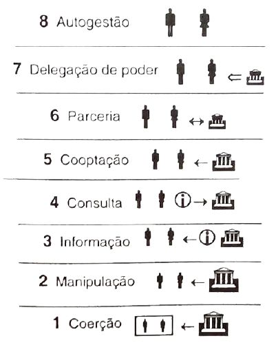 Segundo Souza (2006), as categorias coerção e manipulação são consideradas situações de não-participação, pois se observa a imposição e/ou manipulação dos indivíduos. As categorias informação, consulta e cooptação implicam situações de pseudo-participacão que “não passam de expressões de dissimulação ou falsa participação” (Souza, 2006: 202). Já os três últimos casos — parceria, delegação de poder e autogestão — são considerados participação autêntica, já que as pessoas podem conquistar autonomia nos processos de gestão. Ainda de acordo com o autor, da coerção à autogestão, situações de heteronomia vão sendo substituídas por de autonomia, em face da expectativa de um planejamento mais ou menos democrático.