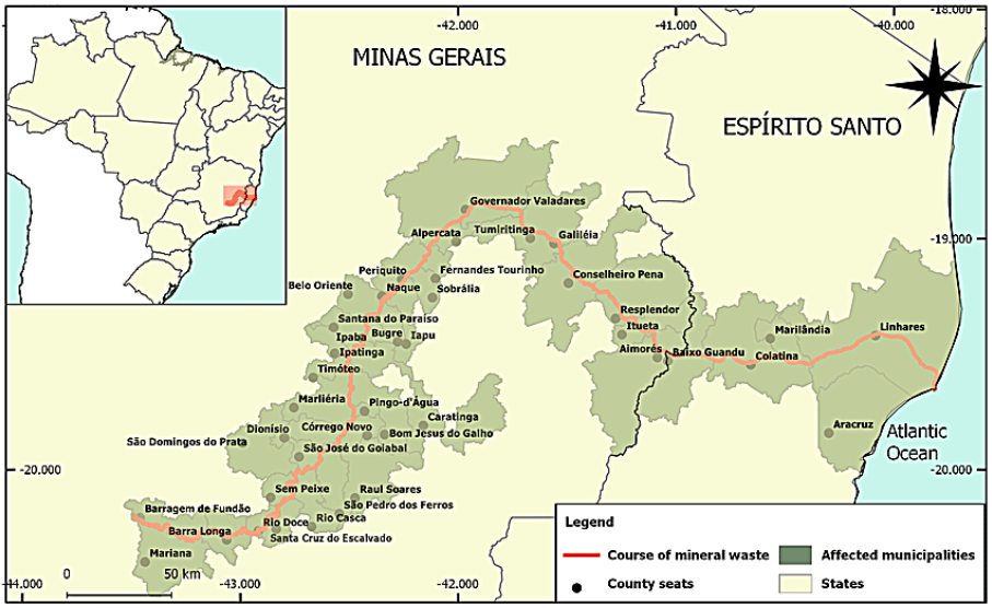 O dia 5 de novembro de 2015 é uma data marcada na história do Brasil (Milanez e Losekann, 2016). Numerosas foram as perdas oriundas do rompimento da barragem de Fundão, área de deposição de rejeitos que se localizava a aproximadamente 2,5 km do subdistrito de Bento Rodrigues (Jacobi, 2015). Com o desastre, os rejeitos de Fundão percorreram cerca de 600 km na bacia do rio Doce até encontrar o litoral do Espírito Santo (Figura 1), atingindo dois estados brasileiros e muitos aglomerados urbanos e rurais por onde passou (Zhouri et al., 2017).