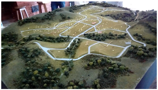 Essas oficinas consistiram na análise, pelas famílias atingidas, de duas propostas de projeto que, até aquele momento, haviam alcançado maior aceitação da comunidade. Sua finalidade não era escolher entre uma ou outra proposta, mas aferir potencialidades e fragilidades para que uma futura versão, embasada nesses resultados, pudesse ser desenhada em maior alinhamento com os anseios da comunidade. As duas propostas foram representadas em maquetes na escala 1/750 (Figura 5) apresentando: a demarcação de cada propriedade — identificadas por números; das vias locais (novas e pré-existentes); dos rios; das áreas de proteção ambiental e dos principais equipamentos comunitários.