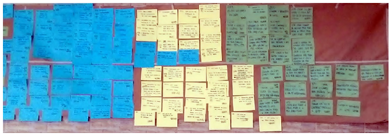As oficinas foram conduzidas pela Cáritas e pela Fundação Renova. A possibilidade de acompanhamento e atuação nestas atividades,7 junto à equipe da Cáritas, foi muito importante para a análise aqui desenvolvida. De modo geral, as atividades das oficinas seguiram o seguinte formato: explicação das propostas de Master Plan às famílias pelos técnicos da Fundação Renova; convite para que as pessoas atingidas expusessem suas dúvidas e opiniões em relação aos projetos, e recolhimento das impressões dos núcleos familiares sobre cada proposta para composição de um mural (Figura 6).
