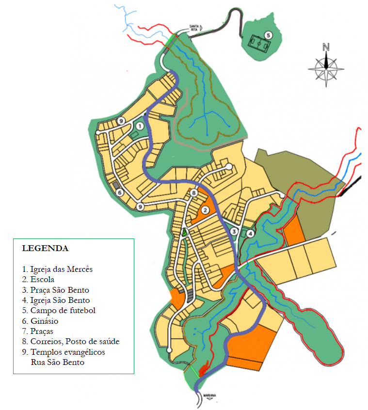 Fundado no final do século XVII, Bento Rodrigues foi um dos primeiros distritos auríferos de Minas Gerais. Distante 35 km do distrito sede de Mariana, o povoado contava com uma população de aproximadamente 600 habitantes, com comércio pouco diversificado e com atividades agrícolas em caráter de subsistência (Silva et al., 2016). Além do cultivo de uma grande diversidade de frutas, legumes e vegetais, parte dos moradores de Bento criava animais domésticos e não domésticos e era rotineiro o deslocamento por cavalo. Seus equipamentos comunitários, assim como suas casas e seus quintais produtivos serviam como a ancoragem de um sistema baseado em relações de vizinhança. Para seus antigos moradores, Bento representava suas bases de apoio existencial. Mais que um local de moradia, as particularidades locais tornaram Bento “uma parte integrante dos seres, como se fosse constituinte dos corpos e consciências [...] onde as pessoas compartilhavam vivências significativas intersubjetivas” (Silva et al., 2016: 78).