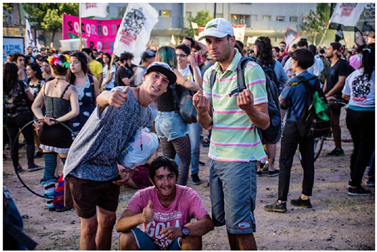 La ocupación compartida de la calle, en conjunción con los múltiples recursos expresivos que se ponen en juego durante la movilización —cánticos, bailes, murgas—, así como las manifestaciones afectivas y corporeizadas —abrazos, saltos, risas, gritos y, en particular, las miradas— brotan enérgicamente desde y hacia los cuerpos, de modo tal que el estar-con-otros, sostenido en la mutua presencialidad de los marchantes, se convierte en el canal expresivo más contundente de la Marcha. Estas “ritualizaciones de contacto”, al decir de Le Breton (2010), dan cuenta del lenguaje emocional que impregna las relaciones sociales, expresado en la manera en que los cuerpos se disponen en el espacio, despliegan sus partituras gestuales, mímicas y kinestésicas en el marco de la protesta.
