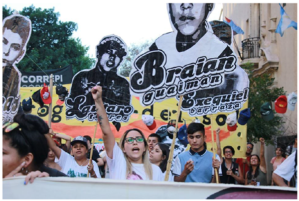 Las modalidades de violencia policial focalizada alcanzan su expresión más extrema en los casos de gatillo fácil. Estos sucesos de homicidio policial han ido aumentando año tras año, lo que ha influido incluso en las demandas de la Marcha: si en sus primeras versiones se enfatizaba en el derecho a la libre circulación y a la habitabilidad del espacio público, oponiéndose a detenciones arbitrarias y reivindicando expresiones culturales de los jóvenes en la ciudad, en los últimos años ha cobrado fuerza el grito de dolor y bronca, empeñado en visibilizar, denunciar y exigir justicia para los jóvenes asesinados. Para dar un ejemplo, en el año 2014, solo hasta septiembre —momento en el que se convocó la mesa organizativa de la Marcha— se contabilizaban en la provincia siete casos de gatillo fácil, es decir, un promedio aproximado de un caso por mes (Roldán, 2019).
