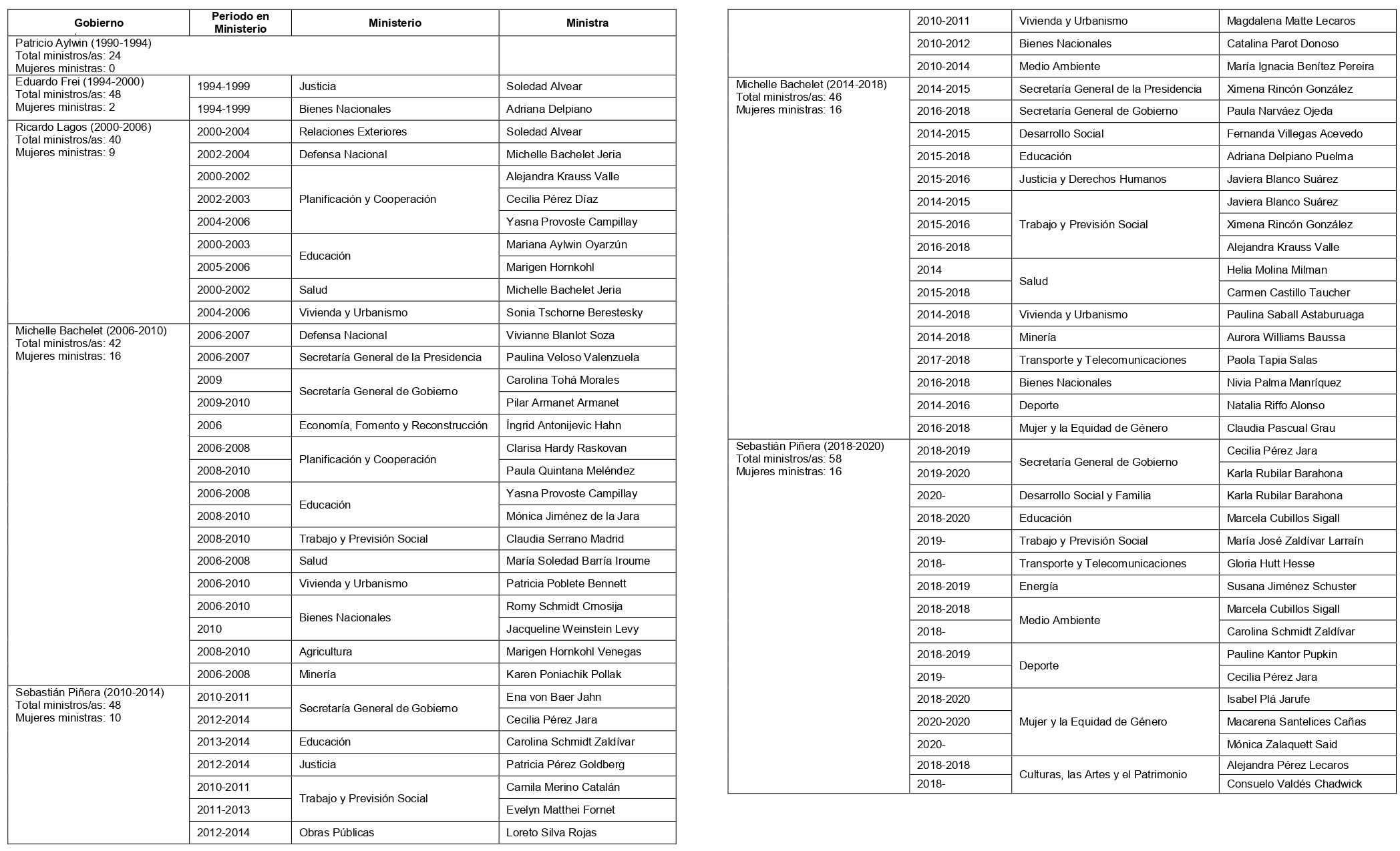 Dicho conteo lo realizamos según asignaciones, por lo que algunas mujeres que lideraron más de un ministerio en un mismo gobierno, o que fueron ministras de diferentes gobiernos, fueron contadas más de una vez. Un caso es el de Michelle Bachelet, quien fue Ministra de Salud de 2000-2002 y luego lideró el Ministerio de Defensa entre 2002-2004, ambos cargos en el gobierno de Ricardo Lagos. En casos como este se contó cada asignación de manera separada.