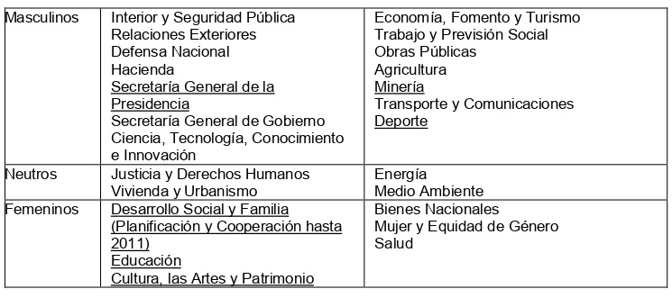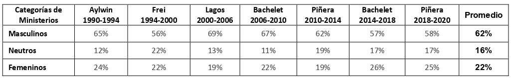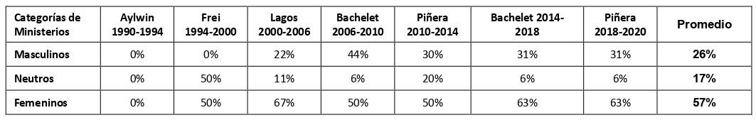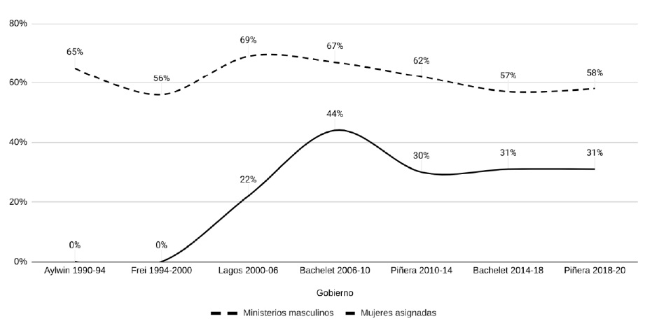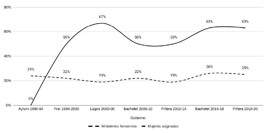 Lo anterior revela que las mujeres ministras están subrepresentadas en los ministerios considerados como masculinos y sobrerrepresentadas en los ministerios considerados como femeninos, demostrando que la asignación de ministerios en Chile continúa replicando los roles de género y las líneas de la división sexual del trabajo. Además, las cifras señalan que el problema persiste en el tiempo. Prueba de ello es la réplica de estas dinámicas por parte del segundo gobierno de Sebatián Piñera, a pesar de mejoras en la equidad de las asignaciones en gobiernos anteriores.