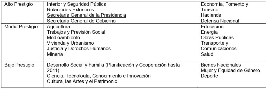 Los ministerios de “alto prestigio” fueron distinguidos en base a su visibilidad y control significativo sobre políticas públicas. [...] En cambio, los ministerios de “medio prestigio” controlan recursos financieros significativos pero tienen menos estatus y visibilidad. [...] Finalmente, los ministerios de “bajo prestigio” se caracterizan por una falta de control de recursos. (Krook y O’ Brien, 2012: 845).