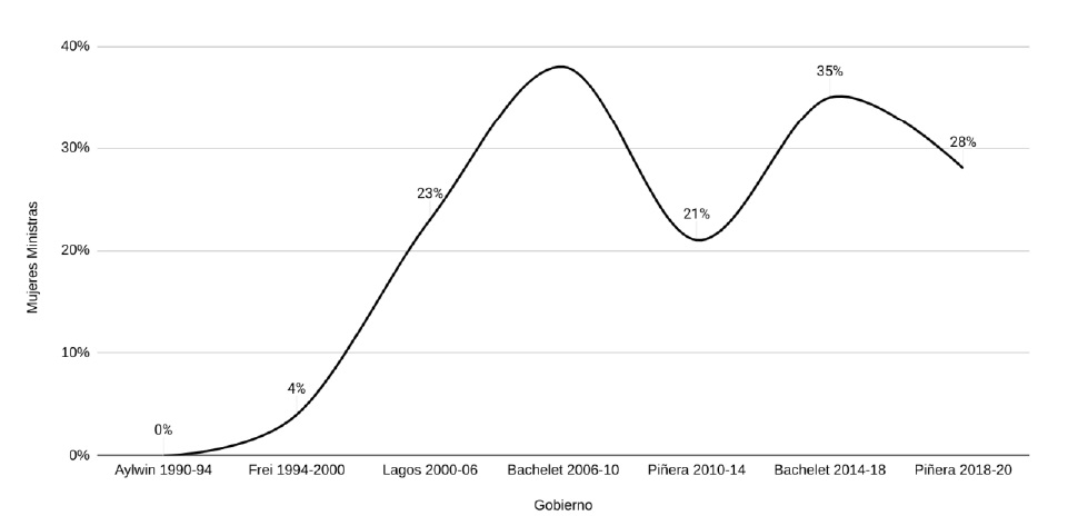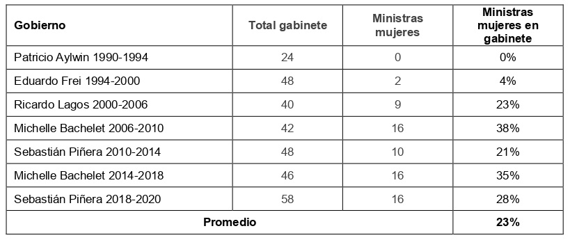 Uno de los espacios políticos que continúa presentando una baja representación de mujeres a nivel mundial es el gabinete. Siendo estos cargos de alta connotación, visibilidad y prestigio (Krook y O’Brien, 2012), resulta particularmente importante lograr en el gabinete una representación descriptiva. Latinoamérica es un caso particularmente interesante dado que presenta un porcentaje más alto de mujeres ministras en comparación al promedio mundial (Escobar-Lemmon y Taylor-Robinson, 2005). Chile se suma a esta tendencia, logrando gabinetes cercanos a la paridad en las últimas décadas. No obstante, al ser estos cargos dependientes de la persona a cargo y no el resultado de cambios estructurales y culturales, estos avances no se han sostenido en el tiempo (Franceschet, 2006).