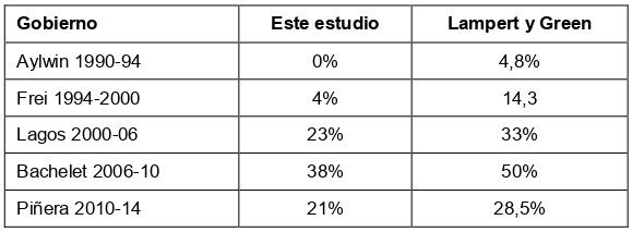 Los resultados varían en comparación a los de otros estudios dado que no contabilizamos los servicios o consejos ministerializados. A modo ilustrativo, en la Tabla 5 comparamos nuestros datos con los encontrados por Lampert y Greene (2014). La variación resulta particularmente simbólica en el primer gobierno de Bachelet. Al momento de asumir la presidencia, el SERNAM y Consejo Nacional de la Cultura y las Artes aún estaban ministerializados por lo que su gabinete fue considerado el primero con asignatura paritaria (Fernández y Rubilar, 2011). Según nuestra metodología, al no contabilizar este Servicio y Consejo, el porcentaje de mujeres ministras se reduce de 50% a 38%. A pesar de esta diferencia, aquel gabinete continúa teniendo la mayor representación de mujeres en el periodo estudiado.