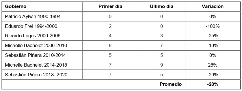 En cuanto a la variación entre el número de mujeres asignadas el primer día de cada gobierno y el último, identificamos que en promedio esta cifra disminuye en un 20% (Tabla 6). Estos datos revelan que la tendencia de los últimos treinta años ha sido que las mujeres ministras sean paulatinamente reemplazadas por hombres ministros, lo que se observa particularmente en el gobierno de Eduardo Frei, durante el cual las dos ministras asignadas el primer día de gobierno fueron reemplazadas, finalizando ese gobierno sin ministras en su gabinete.