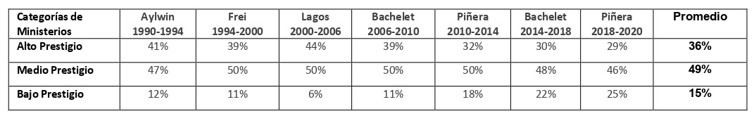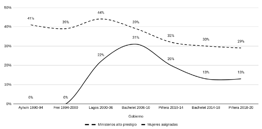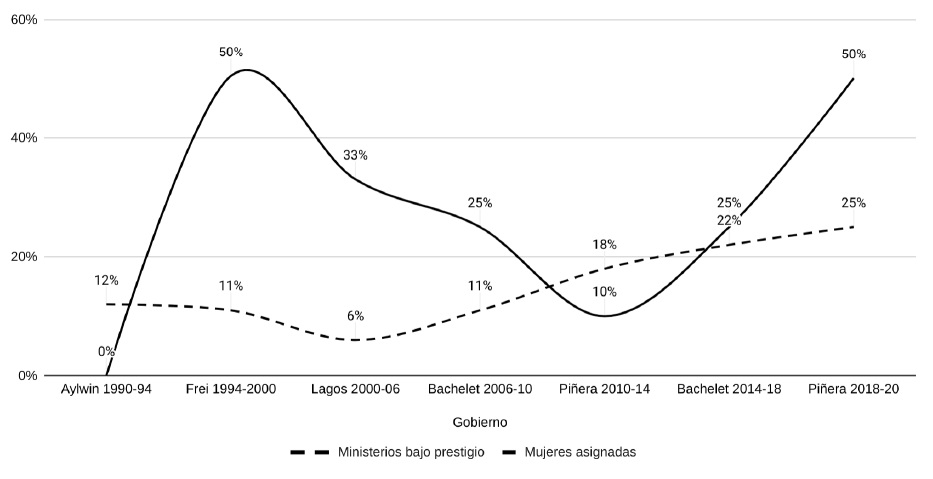 Un análisis comparativo de ambas categorías revela que desde 1990 a 2020 la totalidad de ministerios de alto prestigio son ministerios percibidos como masculinos. Dicho de otra manera, ningún ministerio percibido como femenino es de alto prestigio. De ese espacio, las mujeres ministras han sido excluidas en cada gobierno sin excepción, incluso en el gobierno con mayor equidad en el gabinete, el primer gobierno de Michelle Bachelet. Los ministerios percibidos como masculinos han ocupado un lugar central y de prestigio, revelando la baja apreciación que todavía se tiene en las asignaciones ministeriales por las labores asociadas al género femenino.