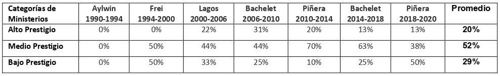 Lo anterior demuestra, según lo esperado, que la participación de mujeres ministras ha sido desproporcionadamente mayor en ministerios de bajo prestigio y menor en ministerios de alto prestigio, replicando la subvaloración de la participación de las mujeres en la esfera pública.
