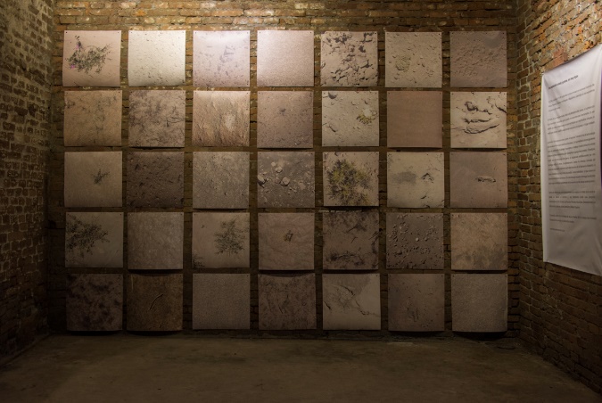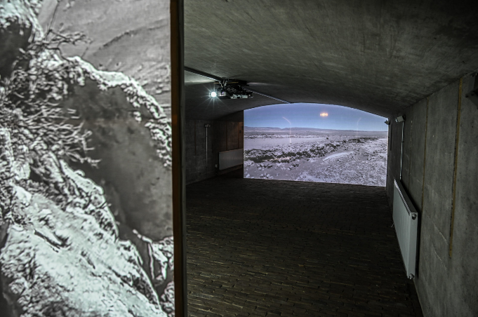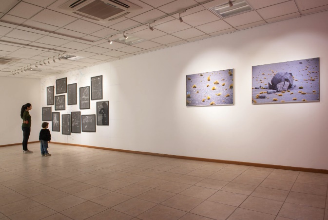 Una explosión sorda y grave, no muy lejos se materializa en una instalación que muestra las formas de acceder y observar dichos campos minados. El registro del ojo mecánico (el dron), los dibujos realizados, los archivos (como aparato de mediación histórica) y el material de audio con registro del sonido de explosiones se encuentran montados en el espacio expositivo de manera que el espectador recorra y se encuentre con el desierto minado desde distintos estímulos de percepción (Figuras 3 y 4).