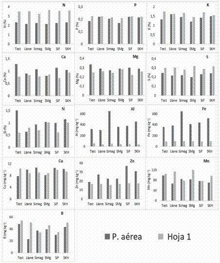 La concentración de N, P y K en la parte aérea y hoja 1, mostró que el N tuvo tendencias de mayor concentración en la hoja 1 al compararlo con la parte aérea (Figura 1). El P presentó una menor concentración en la parte aérea en el testigo. El K mayores tendencias de concentración en la hoja 1 a excepción del Llane, que evidenció una concentración similar. Asimismo, el Ca mostró mayor concentración en la parte aérea. Los contenidos de Mg presentaron un comportamiento similar al Ca, debido a que reveló mayor concentración en la parte aérea y fue similar en la al observar detalladamente el test, SiF y Simag hoja 1 en el SMg. El Si presentó mayor tendencia tendieron a concentrar mucho más Si en la parte a acumularse en la parte aérea que en la hoja 1, aérea que los demás tratamientos.