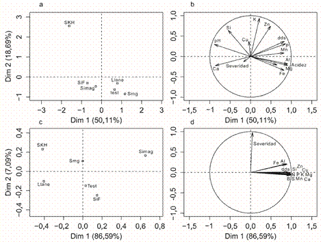 El ACP agrupó los distintos tratamientos, según su similitud en las concentraciones de nutrimentos en el suelo, de acuerdo con la variación que presentó el suelo de las bolsas (Figura 2a, b). El ACP separó los distintos tratamientos en 3 grupos según la dimensión 1 y 2, el primer grupo fue conformado por el SKH, el segundo por SiF y Simag, el tercer grupo fue asignado para Llane, test y SMg. Estos grupos fueron seleccionados según una relación dimensional con respecto a las variables químicas de suelo y, posiblemente, su relación en el comportamiento en las concentraciones obtenidas con el tiempo. Al observar el comportamiento dimensional de las variables químicas con la severidad y el tiempo (dds), se encontró que la severidad evidenció correlación directa con los contenidos de Ca en el suelo y expuso un comportamiento inverso a los de Zn, K, P, Mn y los dds. Por otro lado, el Si presentó correlación directa con los contenidos de Cu y el pH de los suelos, además, corroboraron una correlación inversa con los niveles de acidez, Mg, Fe y Al.