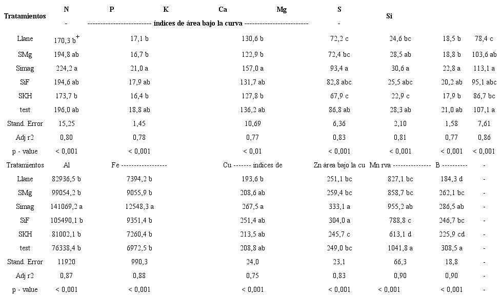 Los aportes de nutrimentos dieron un efecto directo con el crecimiento de las plantas. El Simag mostró la mayor acumulación de nutrimentos, lo cual es determinado por la biomasa acumulada en el tiempo. El índice de área bajo la curva no determina la cantidad de nutrimentos (masa) acumulados, pero sí es sensible en determinar el efecto acumulativo entre 2 y más fechas mediante sus índices. El SiF no se diferencia significativamente del Simag en la acumulación de nutrimentos, pero al evaluar los contenidos de Zn y Mn en la parte foliar y parte aérea de la planta, se encontraron tendencias de una mayor concentración en los tejidos para el Zn, Cu en el tratamiento en comparación al resto. Esto queda demostrado en el Cuadro 12, ya que determinó mayor acumulación a los 300 dds. Además, el Mn presentó una tendencia de estabilización en las concentraciones de la parte aérea y hoja 1 a los 300 dds.