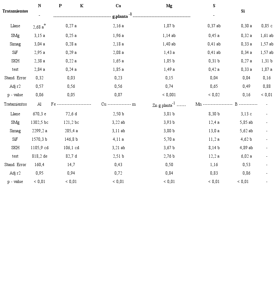 El contenido de N, P, K, Ca, Mg, S y Si aumentó en los tratamientos que presentaron un crecimiento mayor en las plantas (Cuadro 10). El abc del contenido de N y P, mostraron valores más altos (224,2 y 21,0) en el Simag y difieren estadísticamente (α = 0,05) de Llane y SKH. El K y Ca presentaron el mayor contenido en el Simag con diferencias al compararlos con SMg, SKH y Llane. En relación con el Mg y S presentó mayor contenido en el Simag y difieren numéricamente de Llane y SKH. El Si arrojó mayor contenido en Simag, test, SMg y SiF y presentó diferencias significativas con SKH y Llane.