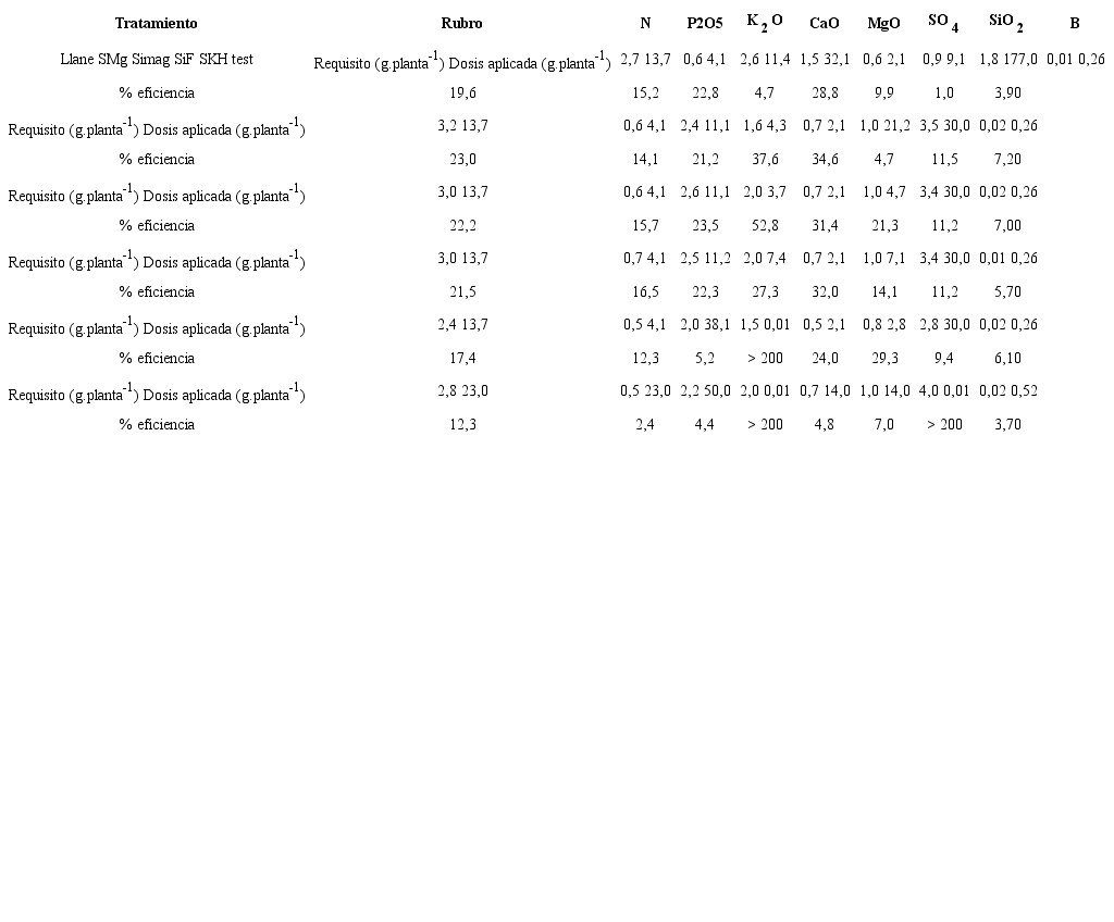 En relación con el Ca, el cual fue suministrado por las fuentes de Si, evidenció que el testigo y SKH presentaron la mayor EF, ya que estos tratamientos no aportaron Ca, sin embargo, al comparar los tratamientos que fueron aplicados con Ca, mostraron que el Simag presentó la mayor EF y que el Llane mostró la menor EF. El Mg, representado en MgO, manifestó que el SMg presentó la mayor eficiencia (34,6) y el testigo la menor (4,8%). El S expresado en SO4 reveló que el SiF evidenció la mayor (36,4%) EF y que el test la menor (7,02 %).