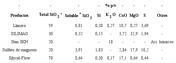 Las partes de Si en el suelo disminuyeron con el tiempo, con excepción del SKH que más bien aumentó (Cuadro 9). El SKH a los 175 dds presentó significativamente la mayor concentración de Si en el suelo (217,2 mg.l-1), este mismo comportamiento se encontró a los 265 dds y fue estadísticamente significativo al compararlo con las demás pruebas. El que mostró el menor contenido de silicio fue el Llane y difiere estadísticamente de las demás fuentes incluyendo el testigo. Cuando se evaluó la concentración de Si a una profundidad de 15 - 30 cm, no se encontró diferencias entre las pruebas en los días 85 y 175 dds. Sin embargo, a los 265 dds el SKH mostró la mayor aglutinación de Si, difiriendo estadísticamente de test, Llane y Simag. Al evaluar las 2 profundidades se encontró mayor tendencia de concentración de Si a 15 - 30 cm en comparación a los primeros 15 cm conforme pasa el tiempo.