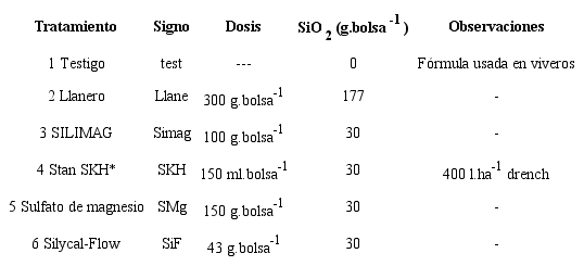 Se procedió a buscar fuentes de Si presentes en Costa Rica que fueran similares a un producto SiO2 feldespatico, debido a que es la fuente utilizada comúnmente en los viveros de Palma Tica. Al observar que la curva de absorción en la planta requiere de al menos 25 gramos de macroelementos (Ramírez y Muñoz 2010), se estimó una cantidad de 30 gramos de SiO2 en la planta, con el fin de calcular la cantidad del elemento requerida por la fuente para el suministro comparativo de Si entre los tratamientos. Después, se seleccionaron 3 fuentes de Si granular y una líquida. Se calcularon las dosis correspondientes para el volumen de suelo que contenían las bolsas de vivero y se pesó en balanza digital para posteriormente ser almacenadas en bolsas plásticas transparentes de polietileno de 11 x 20 cm.