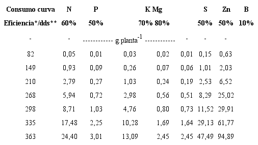La fertilización se llevó a cabo con base en la curva de absorción propuesta por Ramírez y Muñoz (2011), donde se midió el consumo total de nutrimentos en las plantas de vivero correspondiente a 365 días antes de ser sembradas en sitios definitivos (Cuadro 4). Posteriormente, en el 2012 se realizó una validación de la curva, donde se evaluaron distintas dosis de nutrimentos, incluyendo las aplicaciones convencionales en vivero con base en la absorción de las plantas, lo cual demostró su efectividad y su validez en el crecimiento entre las distintas aplicaciones. La fórmula que se utilizó en vivero propuesto por Palma Tica corresponde a 15,50 - 9,76 - 15,50 - 4,00 - 3,20(S) - 0,30(B), constituidas por las fuentes de nitrato de amonio (NAM), microessentials (SZ), cloruro de potasio (KCl), kiessierita y granubor.