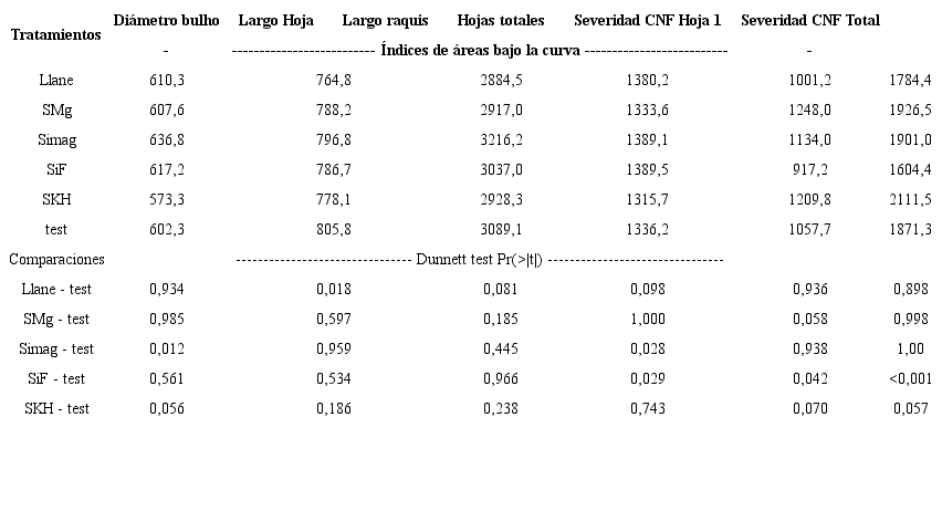 Las fuentes de Si mostraron incrementos en el crecimiento y tolerancia a CNF en vivero de palma aceitera (Cuadro 5). Al evaluar las variables morfológicas cada 45 días, el índice de área bajo la curva (abc) en el diámetro de bulbo presentó diferencia significativa (α = 0,01) en el Simag en comparación al test (testigo) según la prueba de Dunnett test (pr >| t |). El abc en el largo de hoja y largo de raquis no mostraron incrementos importantes en relación con el testigo. No obstante, se encontraron diferencias estadísticas en el abc de hojas totales en Simag y SiF en comparación al testigo (p<0,028). En relación con la incidencia de las enfermedades foliares en vivero, las mismas estuvieron presentes en todas las evaluaciones y se encontró que el abc en severidad en la hoja 1 y total presentaron diferencias altamente significativas al comparar el tratamiento SiF con el testigo (p<0,001), el resto de los tratamientos no manifestaron reducciones en la severidad.