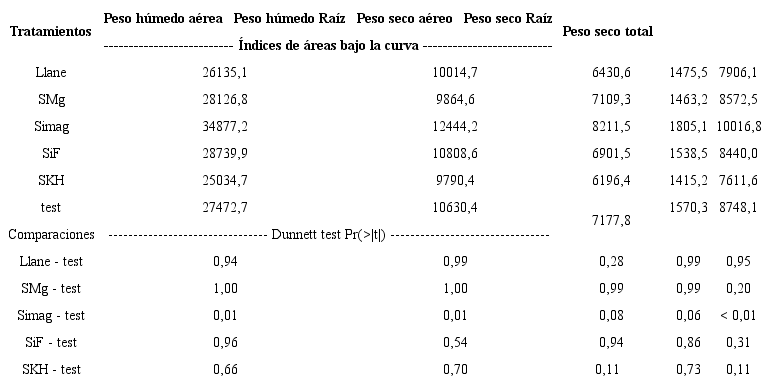 Se detectaron incrementos en biomasa y materia seca al aplicar fuentes de Si. En relación con el peso húmedo en la parte aérea y raíz, el abc presentó diferencias (α = 0,01) en el Simag al compararlo con el testigo o referente (Cuadro 6), las demás pruebas no manifestaron el mismo efecto. Al evaluar el peso seco para ambas partes de las plantas, no mostró diferencias, sin embargo, se encontraron tendencias de mayor acumulación de materia seca en el Simag. Al realizar la sumatoria de los pesos secos de ambas partes de la planta sí se encontraron diferencias (α = 0,01) al comparar el Simag con el testigo, los demás no exhibieron diferencias.