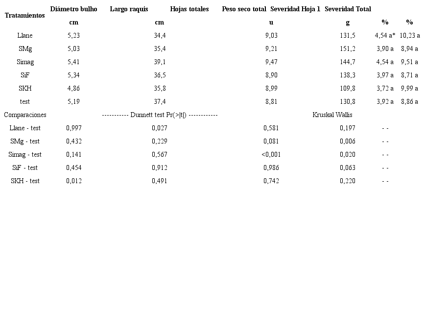 Se identificaron tendencias a una mayor acumulación de materia seca y desarrollo de hojas totales en la mayoría de ensayos a los 300 dds cuando se compararon con el testigo (Cuadro 7). El diámetro de bulbo (cm) y largo de raquis (cm) no presentaron diferencias en los grupos evaluados (α = 0,05) cuando se comparó con el testigo, no obstante, el Simag y SiF manifestaron tendencias de mayor crecimiento (5%). El desarrollo de hojas totales mostró diferencias significativas (α < 0,001) igualmente cuando el Simag se comparó, el resto de las pruebas no reveló diferencias. En la acumulación de materia seca se encontró un mayor peso seco (g) en el SMg y Simag con un 10 y 14% más de materia que el referente, respectivamente, el resto no mostraron diferencias con la particularidad que el SiF evidenció tendencias (pr = 0,06). El porcentaje severidad en la hoja 1 y severidad total (%) en las plantas no manifestó diferencias entre las pruebas.