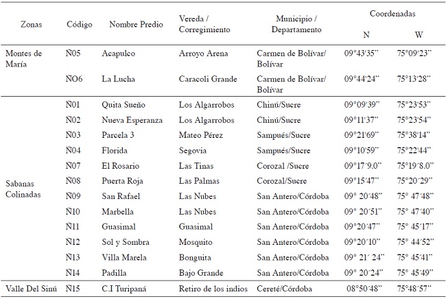 Toma de muestra. Este estudio se realizó en el Centro de Investigación Turipaná (Corpoica) km 13 vía Montería-Cereté (Colombia), las coordenadas geográficas corresponden a los 8°31'16'' de latitud norte y 75°58'11' de longitud oeste. Las muestras fueron tomadas a partir de suelo rizosféricos del cultivo de ñame (Dioscorea rotundata), en la región Caribe Colombiana y las zonas Montes de María, Sabanas Colinadas y Valle del Sinú, para un total de 15 fincas productoras representativas de este cultivo (Cuadro 1).