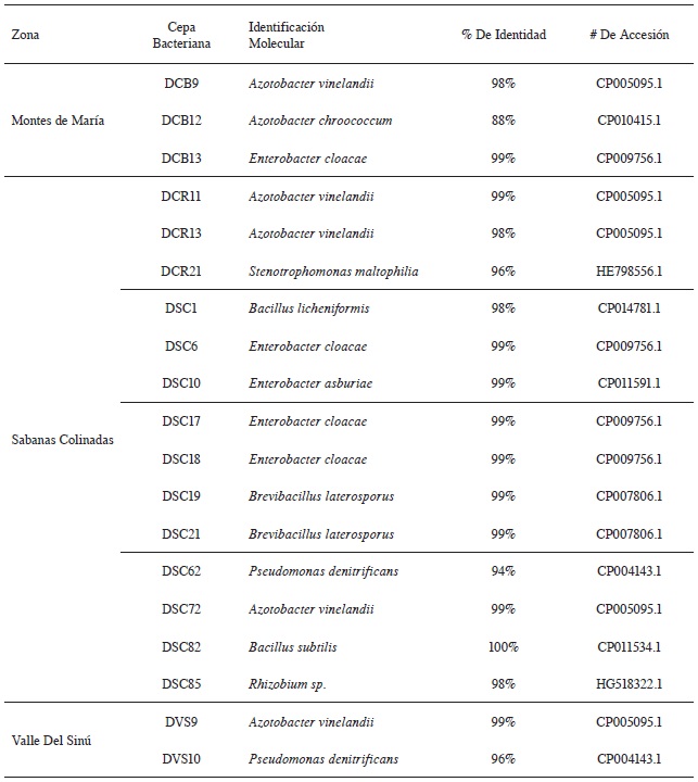 Se aislaron 19 rizobacterias potenciales como biofertilizantes asociadas al cultivo de ñame (Dioscorea sp.), pertenecientes a subregiones Montes de María, Sabanas Colinadas y Valle del Sinú; las cuales fueron identificadas para Montes de María (Azotobacter vinelandii, Azotobacter chroococcum y Enterobacter cloacae), Sabanas Colinadas (Bacillus licheniformis, Enterobacter cloacae, Enterobacter asburiae, Azotobacter vinelandii, Stenotrophomonas maltophilia, Azotobacter chroococcum, Brevibacillus laterosporus, Pseudomonas denitrificans, Bacillus subtilis y Rhizobium sp.) y Valle del Sinú (Azotobacter vinelandii y Pseudomonas denitrificans); las cuales sintetizan auxinas y solubilizan fósforo al facilitar la promoción del crecimiento y desarrollo de la plantas de ñame, lo cual sería una alternativa prometedora como biofertilizantes para este cultivo y una agricultura sostenible al tener en cuenta que disminuiría el impacto sobre el medio ambiente al reducir el uso excesivo de fertilizantes de síntesis química.