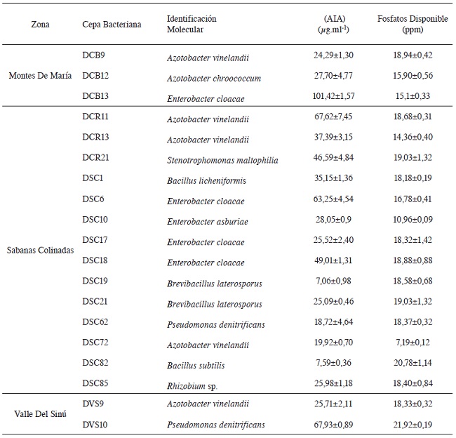 Se realizaron pruebas de habilidades de promoción de crecimiento in vitro, como la producción de AIA y solubilización de fósforo a las 19 bacterias seleccionadas y caracterizadas (Cuadro 3).