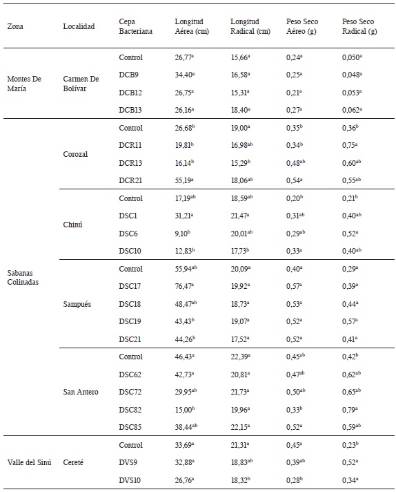 Se observó que la variable denominada peso seco aéreo, localizada en Carmen de Bolívar, mostró incrementos en la cepa Azotobacter vinelandii (DCB9) con un 4% respecto al control sin inocular. La cepa Enterobacter cloacae (DCB13) también presentó incrementos de un 12% con respecto al control sin inocular. En la zona de Sabanas Colinadas en localidad de Corozal Azotobacter vinelandii (DCR13) presentó incrementos 140% con respecto al control sin inocular y la cepa Stenotrophomonas maltophilia (DCR21) presentó diferencias significativas (p≤0,05) de 170%. En la localidad de Chinú el Bacillus licheniformis (DSC1) generó un crecimiento del 55% al compararlo con el control sin inocular. En Sampués la cepa Brevibacillus laterosporus (DSC21) presentó incrementos del 30% en referencia con el control sin inocular. En San Antero se destacaron la cepa de Rhizobium sp. (DSC85) con aumentos de 15%, la cepa Azotobacter vinelandii (DSC72) con 11% y Pseudomonas denitrificans (DSC62) con 4% a partir del testigo sin inocular (Cuadro 4).
