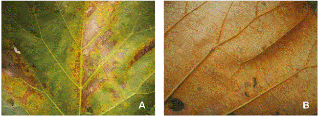 Las hojas de teca afectadas por Olivea tectonae presentan inicialmente manchas necróticas de tamaño y forma variable, de color verdoso que cambia a tonos claros y luego a café y grises (Figura 1A). En el envés se forman estructuras llamadas uredinios, los cuales son eruptivos, cilíndricos y curvados; su abundancia es tan grande que las esporas o urediniosporas que liberan cubren toda la superficie inferior de la hoja, que le dan un color anaranjado y una apariencia polvosa (Figura 1B) (CABI 2017, Cibrián y Arguedas 2007).