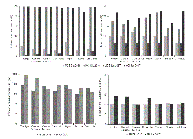 Por su parte, Lundgren y Fergen (2011) indican que, en cultivos de maíz, las coberturas redujeron las poblaciones de la plaga subterránea Diabrotica virgifera (Coleóptera, Chrysomelidae) al aumentar las poblaciones de sus depredadores. En el caso de cultivos de la palma aceitera, Giller y Fairhurst (2012) en Malasia y Arango et al. (2011) en Colombia, indican que las coberturas de leguminosas reducen la incidencia de plagas y de insectos vectores de importantes enfermedades, ya que este tipo de coberturas controla el desarrollo de malezas de gramíneas, en las cuales estos insectos pasan parte de su ciclo de vida. Al respecto, hay que mencionar que en estado larval, las especies de Rabdopterus se alimentan de las raíces más finas de gramíneas (Muñoz 2002, Arguedas et al. 2013).