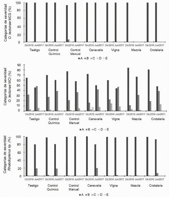 Con respecto a la distribución por categorías de severidad, para O. tectonae en MCS, a excepción del Control Manual, todos los individuos enfermos se encuentran en la categoría A; en MCI sí hay individuos en otras categorías, pero siempre predominan aquellos que se encuentran en la A. Para Rhabdopterus sp., también hay una gran incidencia de individuos en la Categoría A, lo que puede considerarse que las severidades son leves.