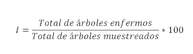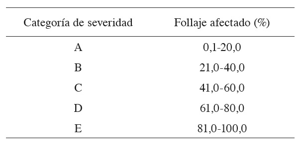 La incidencia indica la cantidad de árboles enfermos con respecto a la totalidad de árboles evaluados, la severidad evalúa la frecuencia con la que se presentan las diferentes categorías de daño en relación con el total de árboles enfermos. Para este ensayo, se utilizaron 5 categorías de severidad respecto al porcentaje de follaje afectado por cada una de las 2 plagas (Cuadro 1).
