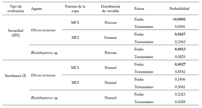 Por su parte, en la evaluación del efecto de los tratamientos, ninguno evidenció respuestas significantes en severidad e intensidad del ataque de los patógenos; sólo en algunos casos en la fecha de evaluación. Esto es en la variable Severidad de Olivea tectonae en MCS (p<0,0001), Severidad de Olivea tectonae en MCI (p=0,0167), Severidad de Rhabdopterus sp. (p=0,0013) e Incidencia de Olivea tectonae en MCS (p=0,0027).
