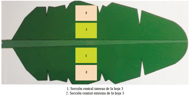 Se determinó el contenido de boro foliar en 87 muestras de plantas de banano con diferentes dosis de aplicación de boro, del área experimental de CORBANA S.A. en finca La Rita, ubicada en la provincia de Limón, cantón de Pococí, distrito La Rita, durante el 2015. Las muestras fueron tomadas de la sección central interna de la tercera hoja (lámina) de cada planta, sin incluir la nervadura, así como en la sección central externa de la lámina (Figura 1).