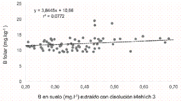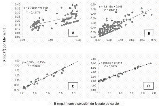 Diversos autores (Schuman et al. 1992, Matula 2009, Zbíral 2016) indican que la disolución extractora Mehlich 3 se correlaciona estrechamente con el contenido de boro en el suelo, producto de aplicaciones diferenciadas del microelemento.