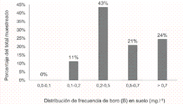 Se analizaron muestras de referencia de tejido foliar del programa International Plant Analytical-Exchange (IPE) de WEPAL, con diferentes contenidos de boro, con el fin de asegurar la exactitud del método analítico (WEPAL 2015b). Los datos de contenido de boro en suelo y foliar se analizaron mediante análisis de correlación y diagramas de frecuencia utilizando el programa Microsoft Excel 2013.