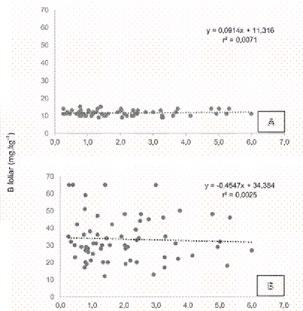 La mayoría de los suelos muestreados presentaron niveles adecuados de boro. Los niveles de boro en suelo recomendados para el cultivo de banano, según Coke y Boland (1971), citado por Ortega et al. (2009), deben encontrarse de 0,1 a 1,0 mg.l-1. El 89% de los suelos evaluados mostraron contenidos sobre el nivel crítico (0,2 mg.l-1) indicado en la Guía de Interpretación de análisis de suelo utilizada por el Centro Agronómico Tropical de Investigación y Enseñanza (CATIE) (Bertsch 1995) y sólo 10% presentaron niveles mayores a 1,0 mg.l-1. Además, Ortega et al. (2009) encontraron que es a partir de niveles mayores a 2,08 mg.l-1 de boro en suelo que observaron síntomas de toxicidad y quema de bordes de las hojas. En el caso del boro, su deficiencia o toxicidad puede expresarse con mayor facilidad en comparación con el resto de los nutrimentos, dado que el ámbito entre deficiencia y toxicidad es muy pequeño (Vargas et al. 2007), debido a esto debe ser usado en forma muy cuidadosa.