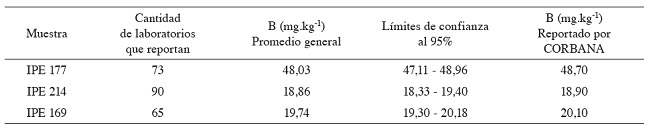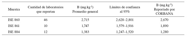 Se analizaron muestras de referencia del programa International Soil Analytical-Exchange (ISE) de Wageningen Evaluating Programs for Analytical Laboratories de Holanda (WEPAL) con diferentes contenidos de boro, con el fin de confirmar si la metodología genera resultados comparables con otros laboratorios en el mundo y, de esa forma, asegurar la exactitud (WEPAL 2015a).