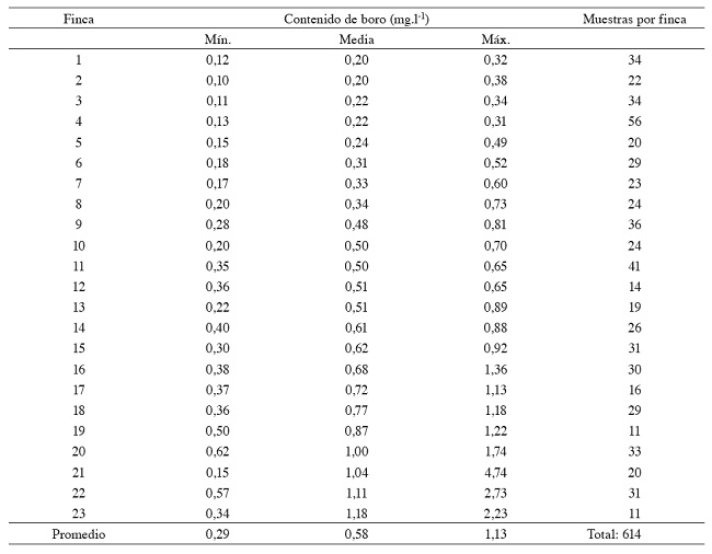 Los resultados referentes al contenido de boro en el suelo de fincas bananeras consideraron las 614 muestras totales.