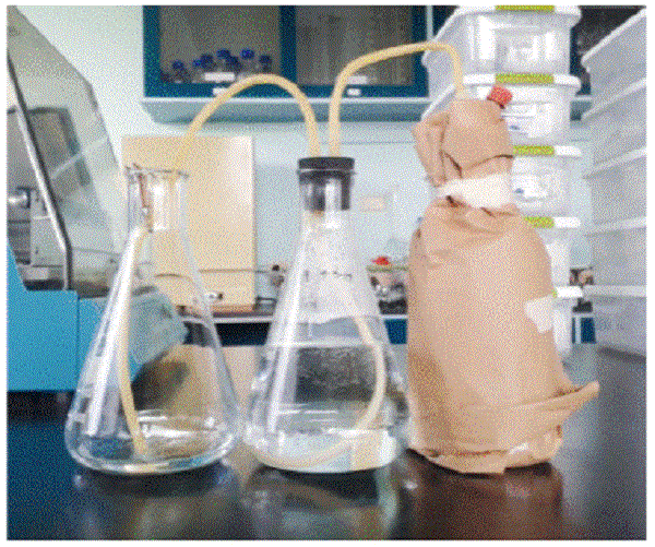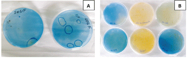 Aislamiento de microorganismos solubilizadores de fósforo: con el fin de promover la multiplicación de los microorganismos (Castro et al. 2015) se incubó 500 ml de la muestra con 250 ml de semolina y 50 ml de melaza a un nivel de humedad adecuado. El material se dividió en 2 botellas de 1 L cerradas y con una salida para el gas, producto de la respiración de los microorganismos y se dejaron reposar en oscuridad por un período de un mes (Figura 1). Después de la incubación del material sólido, se tomaron 20 g del contenido de cada una de las botellas y se mezclaron con 500 ml de agua sin cloro y 18,4 ml de melaza, y se dejaron en oscuridad durante 12 días. Luego se procedió a aislar tanto del componente sólido como del líquido, los microorganismos con capacidad solubilizadora de P, para lo que se utilizó el medio del cultivo Osorio y Habte (2001) al cual se le adicionó roca fosfórica con un tamaño de partícula entre 90 y 500µm y utilizando la metodología de diluciones seriadas (Lorch 1995). A partir del día 2 se aislaron las colonias que mostraron habilidad para solubilizar P, las cuales se identificaron por la producción de un halo amarillo (Figura 2A) como consecuencia de un cambio en el pH (Kim et al. 1997, Osorio y Habte 2001), ya que el verde de bromocresol es color azul a pH mayor a 5,4 y cambia a amarillo por debajo de este valor. Seguidamente, se realizaron los aislamientos necesarios para obtener colonias de microorganismos puros y monitorear que conservaran su habilidad solubilizadora (Figura 2B).