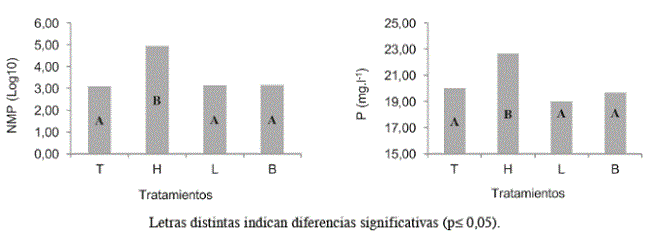 Se refuerzan los resultados al realizar el recuento de los microorganismos solubilizadores de P presentes en el suelo 3 meses después de la cosecha, ya que se determinó que la población (NMP) fue casi 100 veces mayor en el tratamiento inoculado con Aspergillus flavus (H) en comparación al testigo (T) (Figura 11), población atribuida al efecto del microorganismo inoculado. Por otro lado, la cantidad de P soluble en el suelo fue 2,67 mg.l-1.3 meses-1 mayor en este mismo tratamiento con respecto al Testigo (Figura 11).