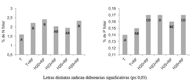 Al analizar las concentraciones de N y P foliar (Figura 13) se determinó que la aplicación de RF permitió que se incrementaran los contenidos de N foliar, mientras la adición de RF no fue suficiente para aumentar los contenidos de P foliar de manera significativa. Pero cuando el suelo se inoculó con los hongos y se adicionó también RF, la concentración de P foliar se incrementó hasta en un 13% sobre el tratamiento al que se le aplicó solo RF (Figura 13) y en un 21% si se compara con el testigo sin RF.